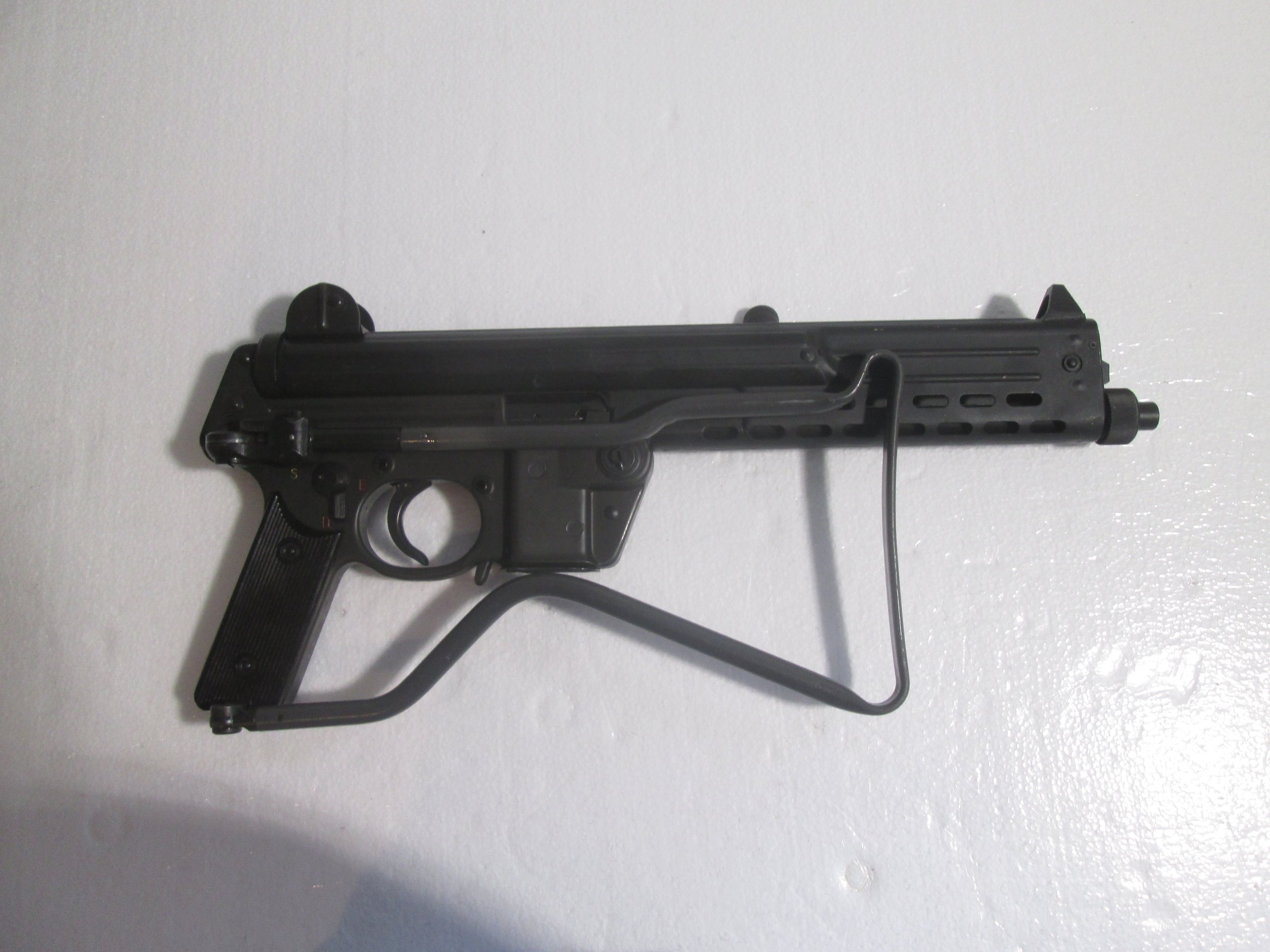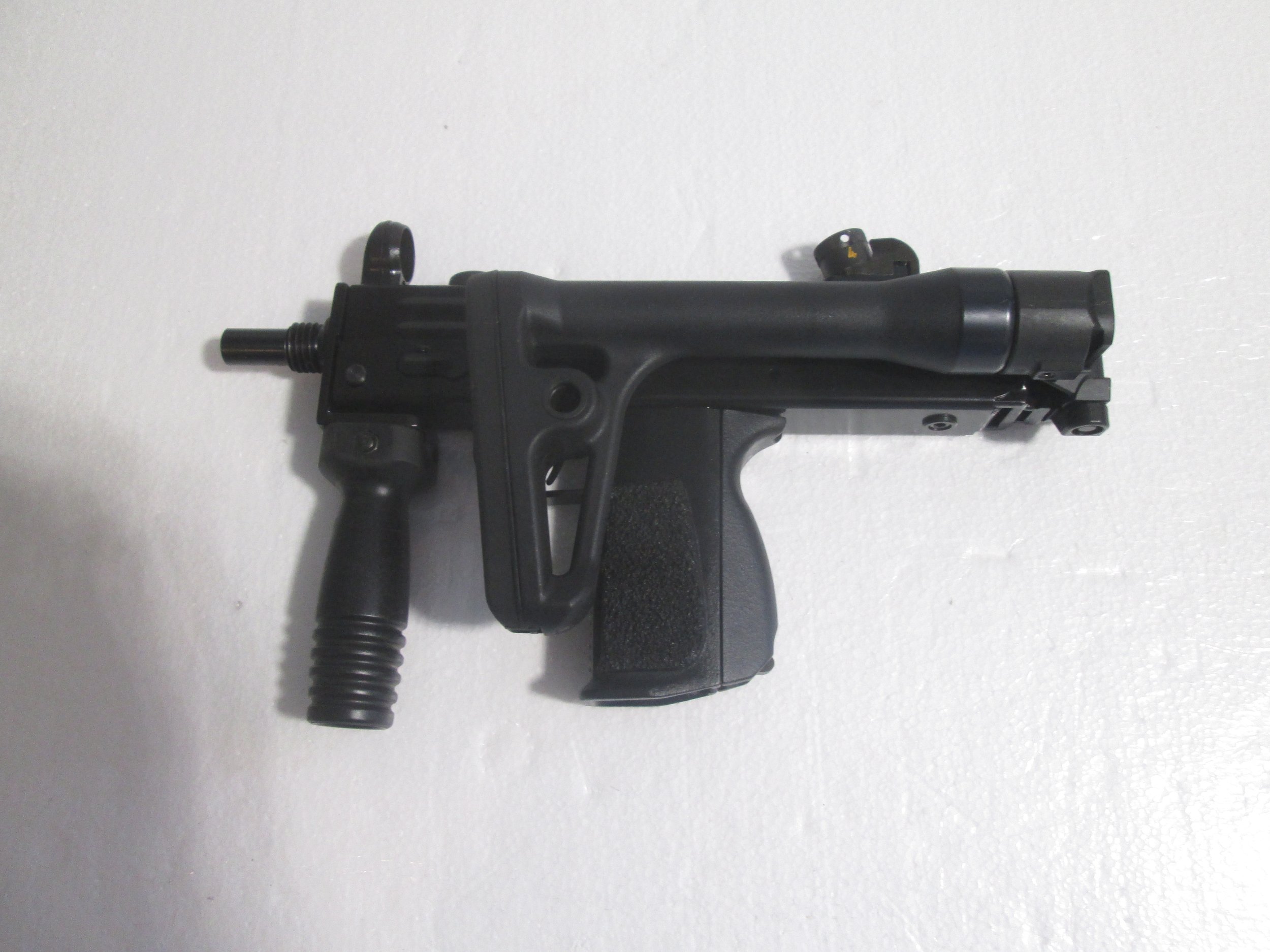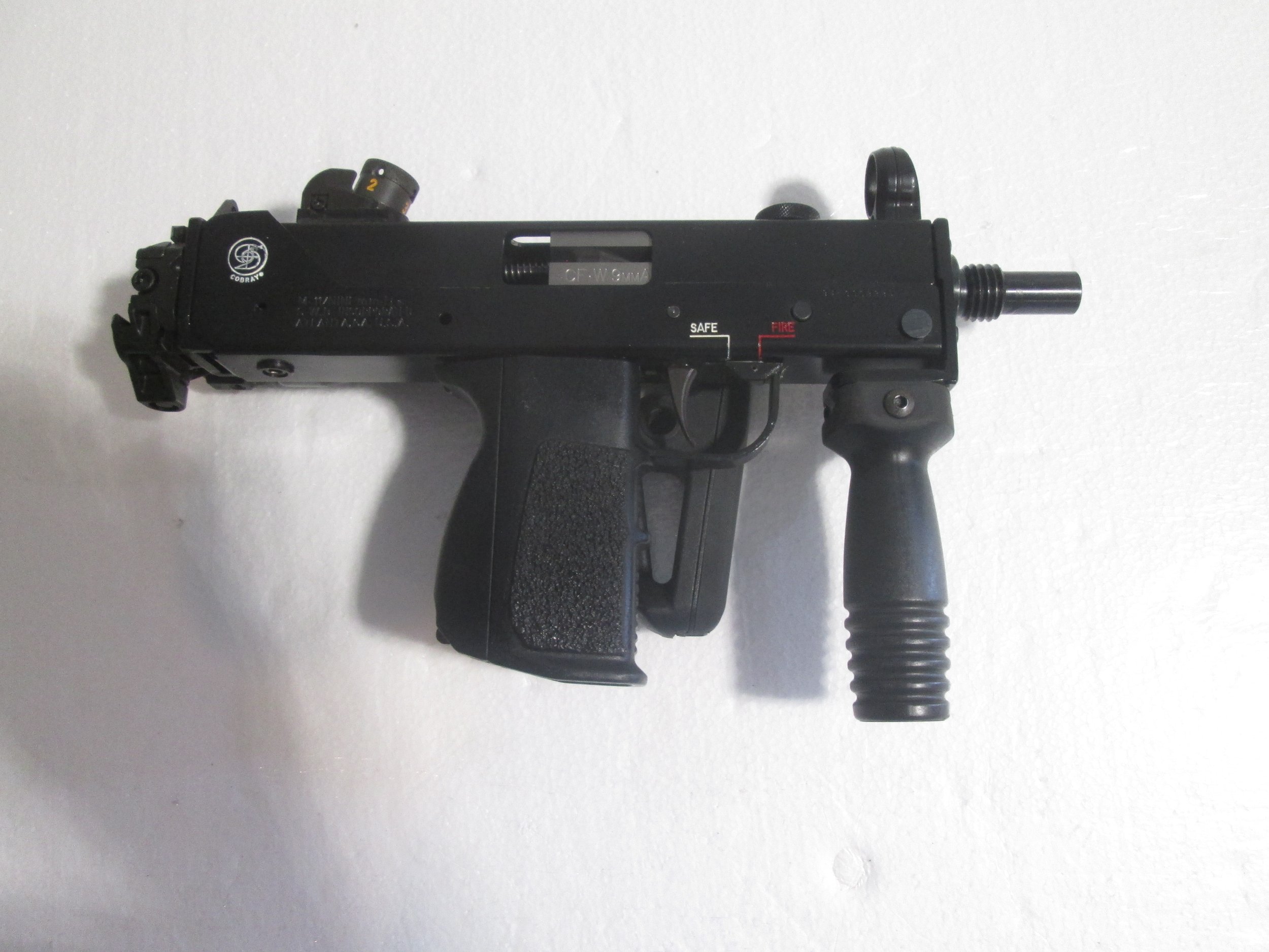 SWD M11/9 9MM SUB MACHINE GUN. THIS GUN HAS HAD ALOT OF UPGRADED TO INCLUDE A CFW SLOWFIRE BOLT WITH EXTRA SPRINGS TO CHANGE THE FIRE RATE. SIDE FOLDING STOCK . HK STYLE FRONT AND REAR SIGHTS AS WELL AS A FOREGRIP ,ALSO INCLUDES 4 30RD SWD POLYMER MAGS IN POUCH AND MUZZLE PROTECTOR. PRICE IS 16000.00