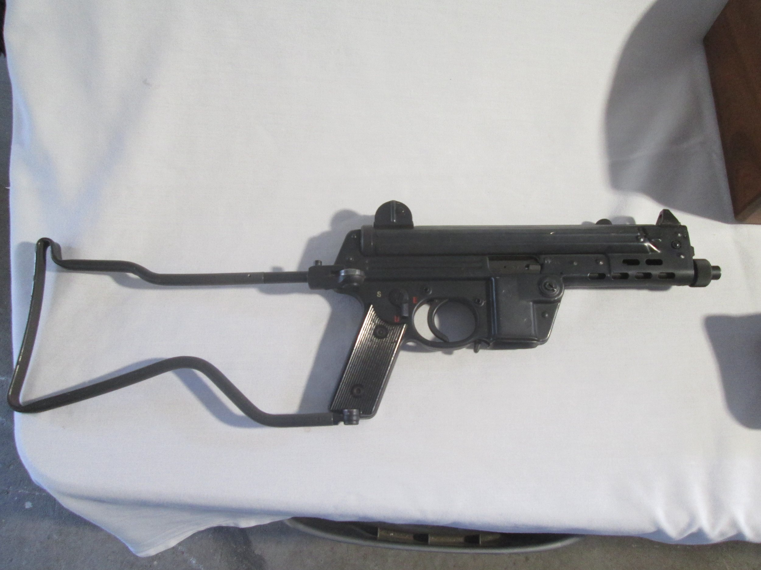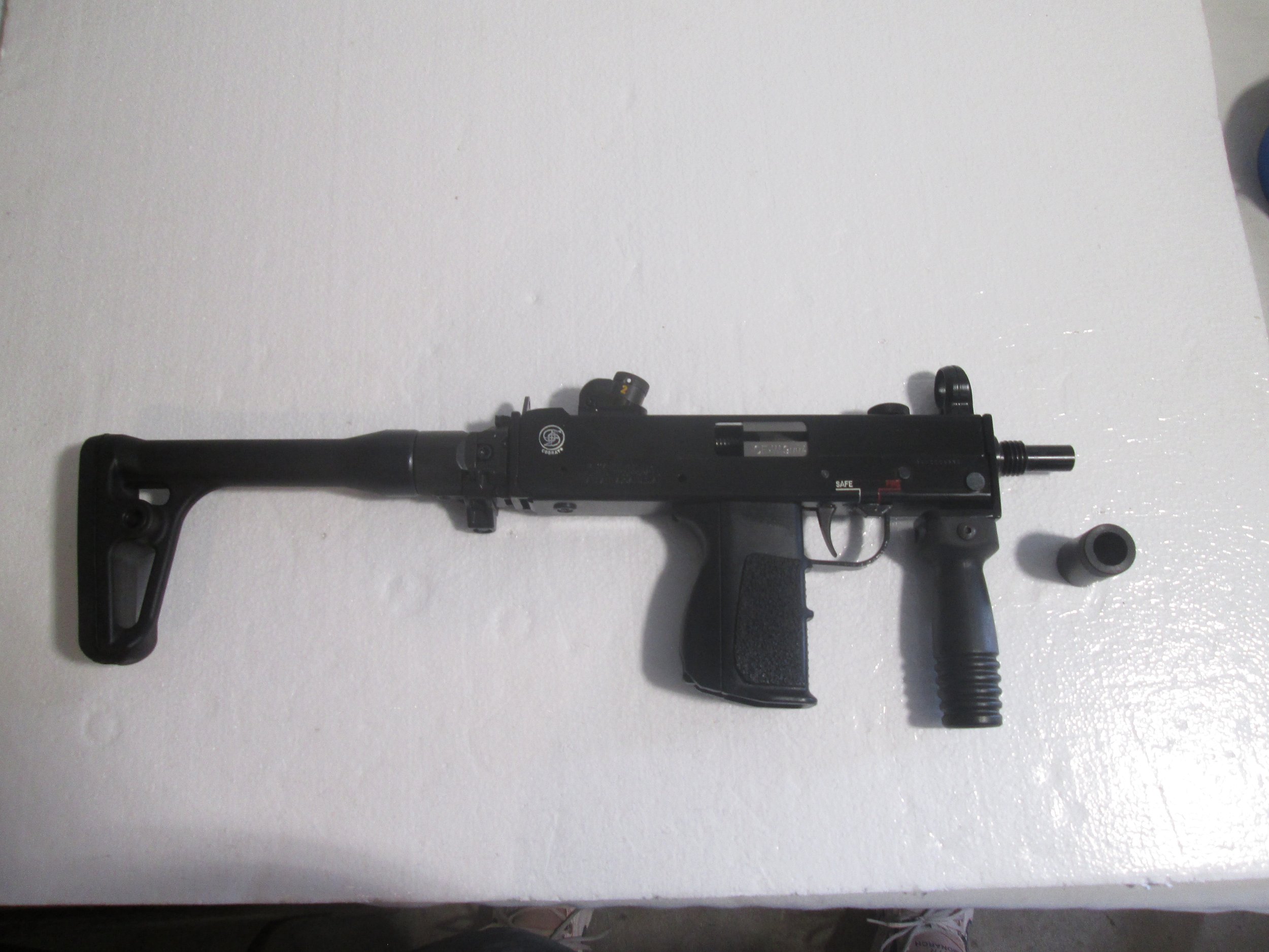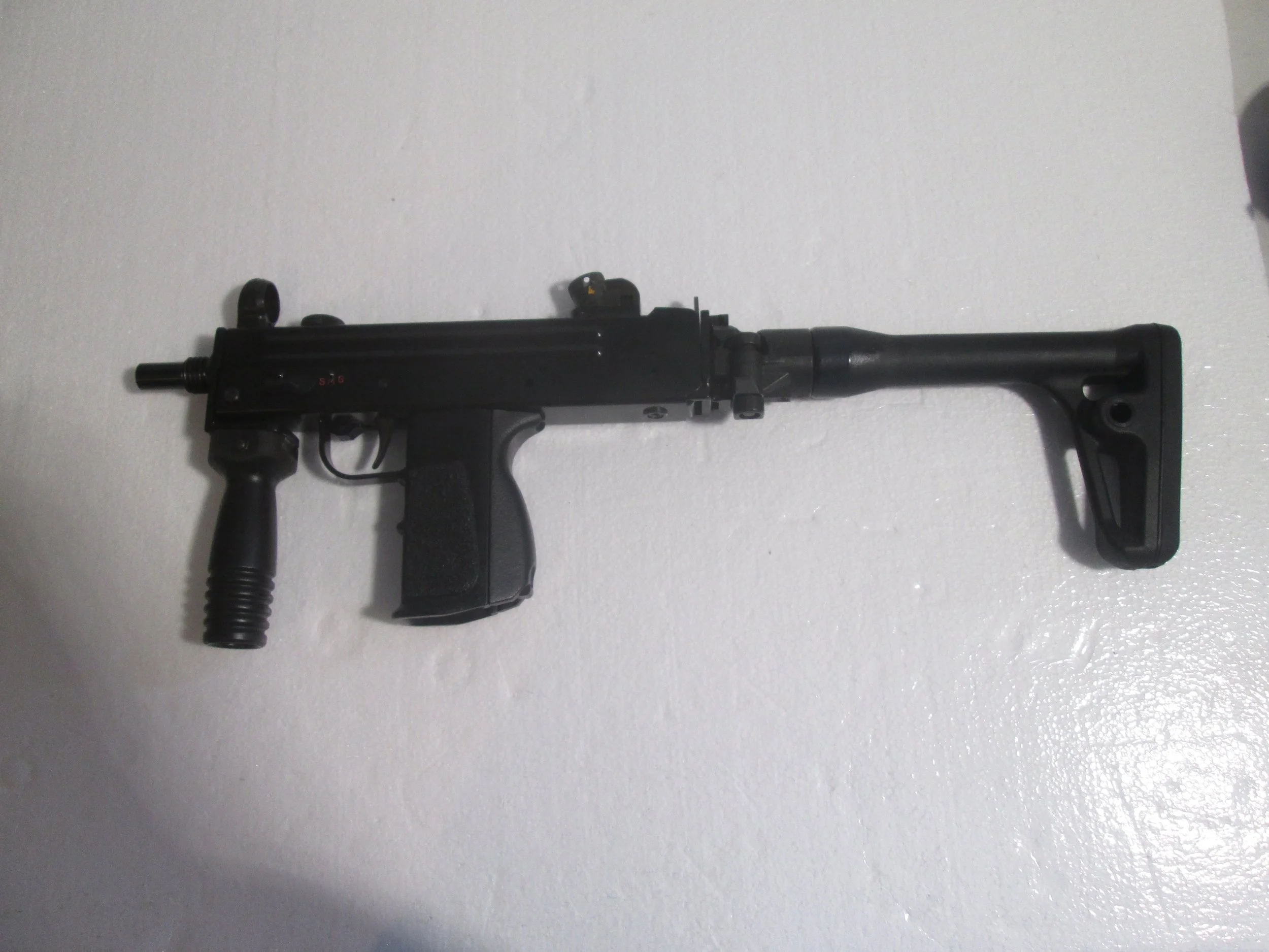SWD M11/9 9MM SUB MACHINE GUN. THIS GUN HAS HAD ALOT OF UPGRADED TO INCLUDE A CFW SLOWFIRE BOLT WITH EXTRA SPRINGS TO CHANGE THE FIRE RATE. SIDE FOLDING STOCK . HK STYLE FRONT AND REAR SIGHTS AS WELL AS A FOREGRIP ,ALSO INCLUDES 4 30RD SWD POLYMER MAGS IN POUCH AND MUZZLE PROTECTOR. PRICE IS 16000.00