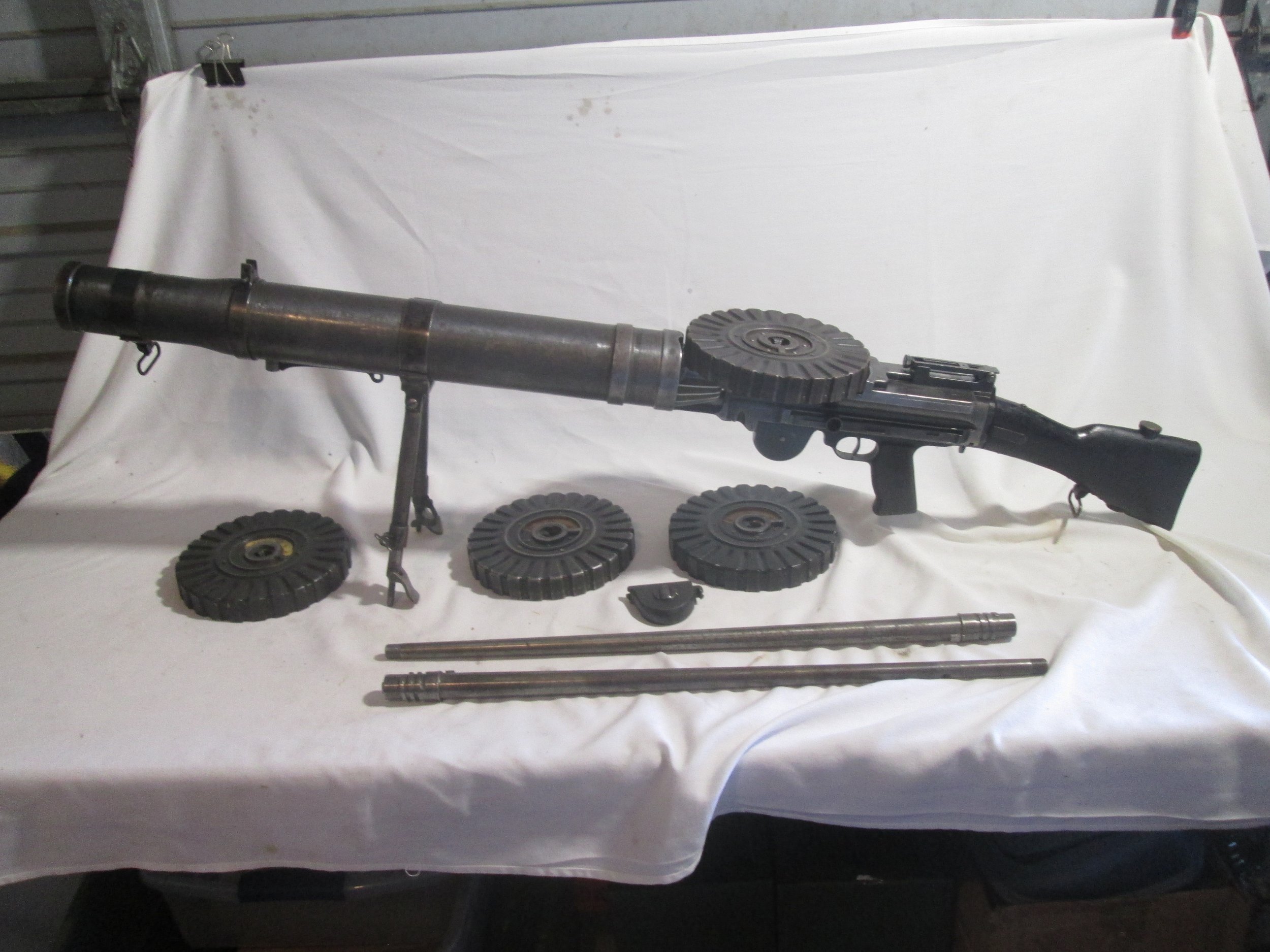 1914 BRITISH BSA LEWIS GUN 303. THIS IS A REWATT ORIGINAL BRITISH LEWIS GUN IS 303 CALIBER . THIS GUNS COMES WITH ITS ORIGINAL TRANSIT CHEST AND ORIGINAL DEMILLED BARREL REMOVED AND LIVE 303 BARREL INSTALLED. ALSO INCLUDES 2 EXTRA LIVE 303 BARRELS, 4 PAN MAGS , LOADING TOOL AND MANUAL PRICE IS 25000.00